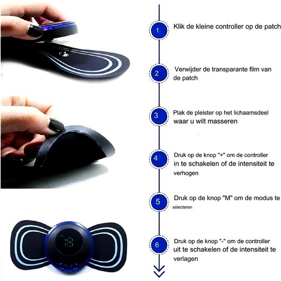 Plaats beide op de Lichaam, druk op de “+” of “-” knop om het apparaat in te schakelen, en pas de intensiteit aan. Druk op “M” om van modus te veranderen.